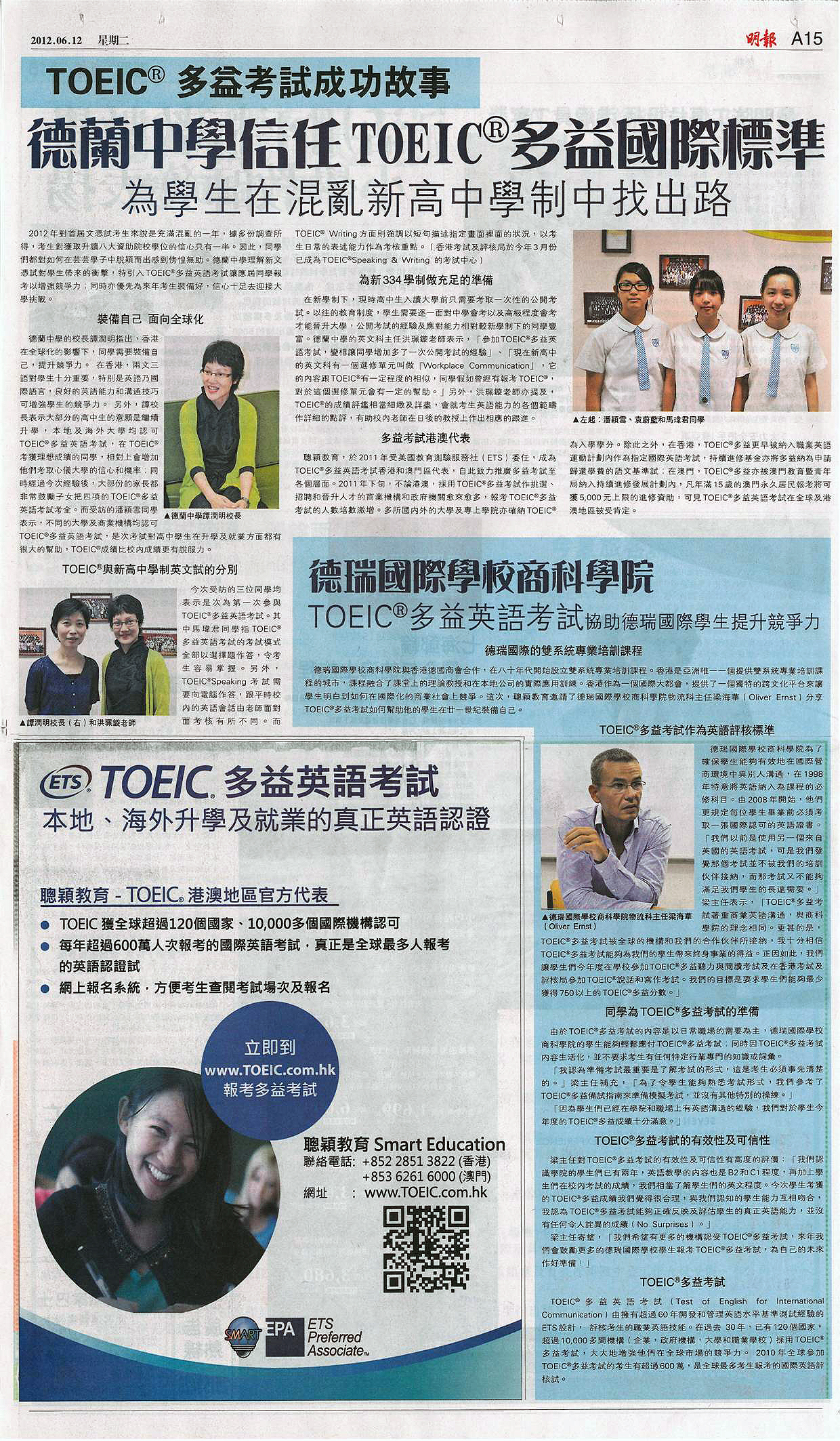 在新學制下,現時高中生入讀大學前只需要考取一次性的公開考試。以往的教育制度,學生需要逐一面對中學會考以及高級程度會考才能晉升大學,公開考試的經驗及應對能力相對較新學制下的同學豐富。德蘭中學的英文科主任洪珮鏇老師表示,「參加TOEIC® 多益英語考試,變相讓同學增加多了一次公開考試的經驗」、「現在新高中的英文科有一個選修單元叫做『Workplace Communication』,它的內容跟TOEIC® 有一定程度的相似,同學假如曾經有報考TOEIC® ,對於這個選修單元會有一定的幫助。」另外,洪珮鏇老師亦提及,TOEIC®的成績評鑑相當細緻及詳盡,會就考生英語能力的各個範疇作詳細的點評,有助校內老師在日後的教授上作出相應的跟進。